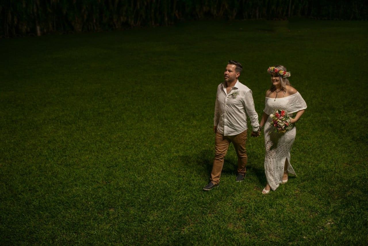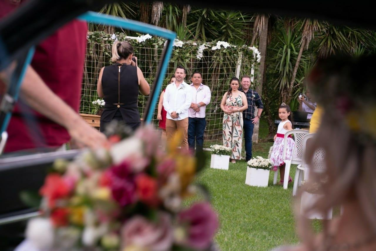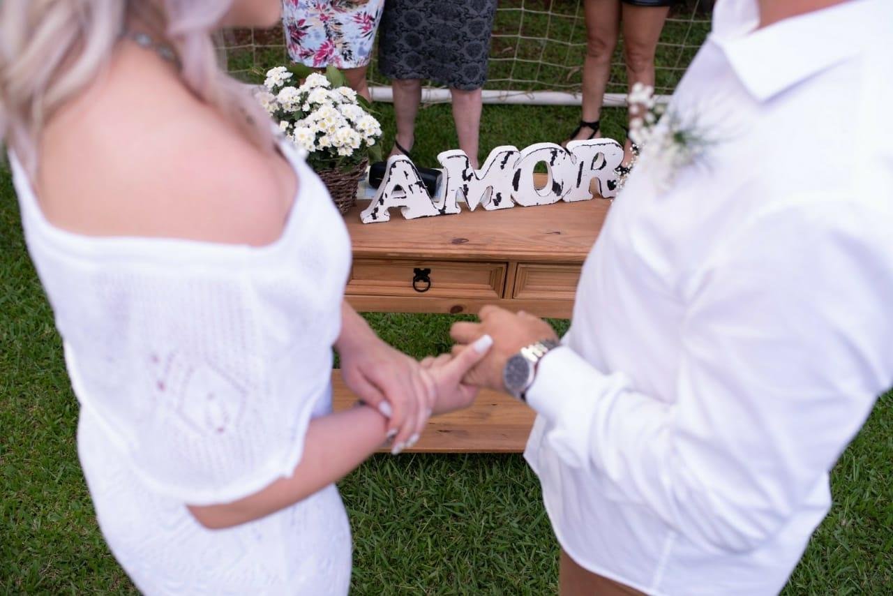 Decidimos nos casar em agosto do ano passado. Inicialmente, em função da pandemia, nossa ideia foi aguardar para realizarmos uma festa maior quando fosse seguro. Porém, esse momento futuro de mais segurança, parecia cada vez mais longe.... Resolvemos, então, readequar o formato do casamento, para conseguir realizar esse sonho no momento em que nossa vida se alinhava para isso e mantendo a segurança. Conversamos, então, com a nossa cerimonialista, dizendo que queríamos um formato diferente, iríamos nos casar presencialmente apenas diante de nossos pais e padrinhos, transmitindo parte da celebração para nossos amigos mais próximos por meio de uma live...
